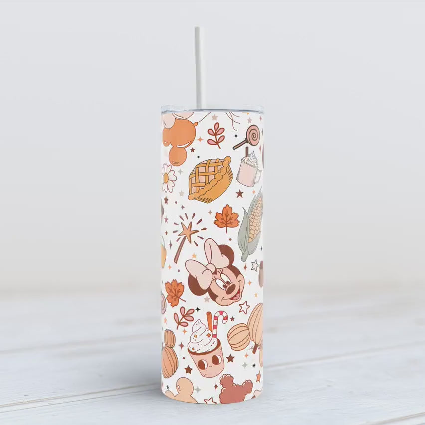 Celebrate the cozy charm of autumn with our Autumn Magic 20oz Skinny Tumbler. Wrapped in a whimsical fall scene full of pumpkins, falling leaves, and warm seasonal hues, this tumbler is perfect for sipping your favorite drinks on crisp days.