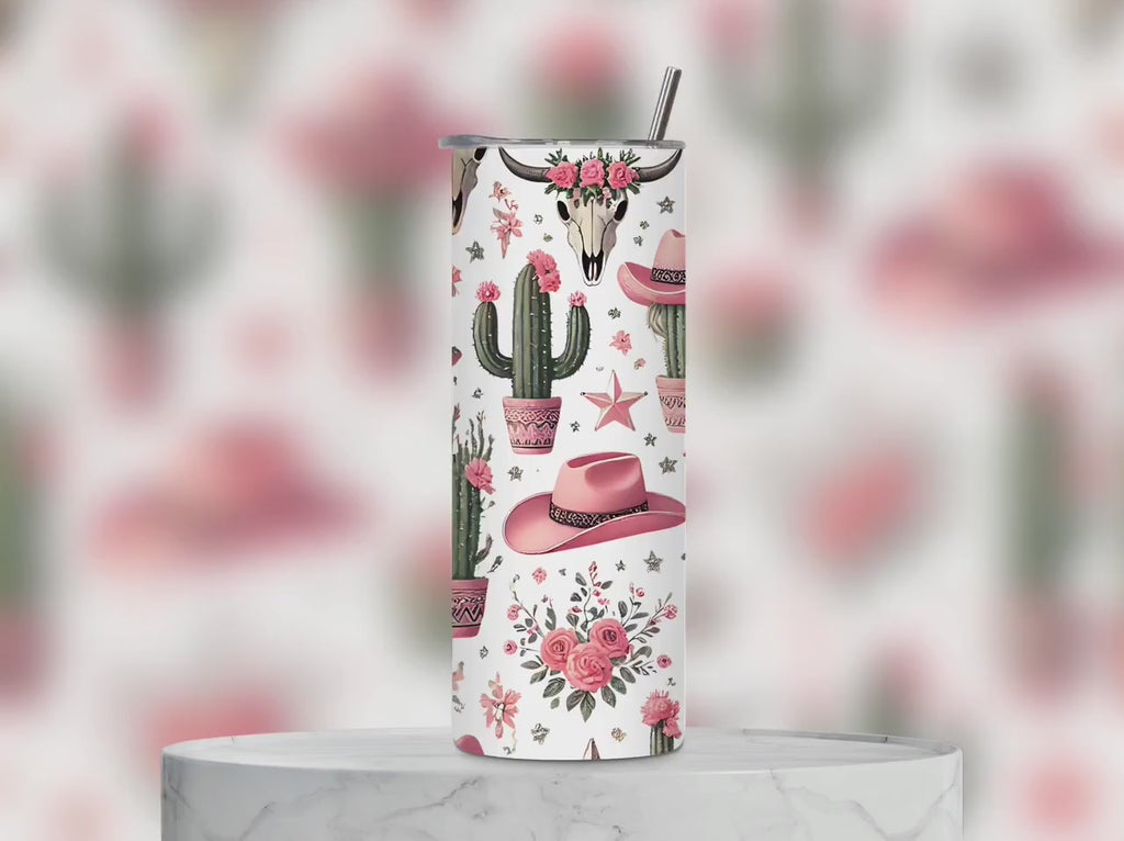 Add a touch of rodeo charm to your daily drinks with our Pink Cowgirl 20 oz Skinny Tumbler! Featuring a seamless western-themed wrap—cacti, cowgirl boots, and country flair in stylish pink—this tumbler combines fun design with functional durability.
